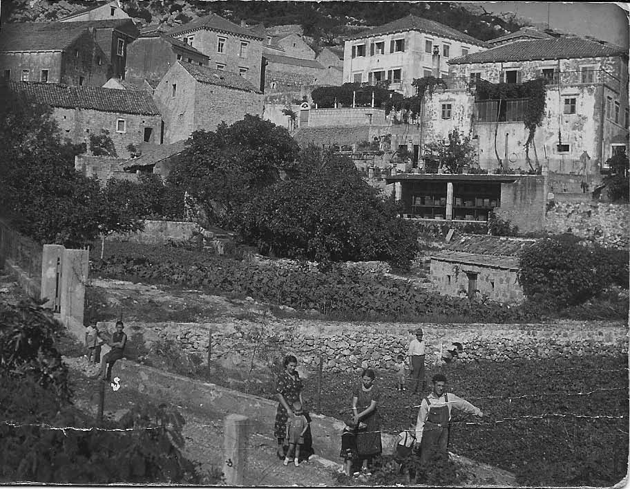 Na zidu sjedi Božo Cvrlje. Prva žena sa djetetom Ane i Darij Jasprica. Druga žena: Marija i Jagoda Šegović. Muški: Mato i Tino Šegović. Čovjek u vrtu Niko Šegović i ? |