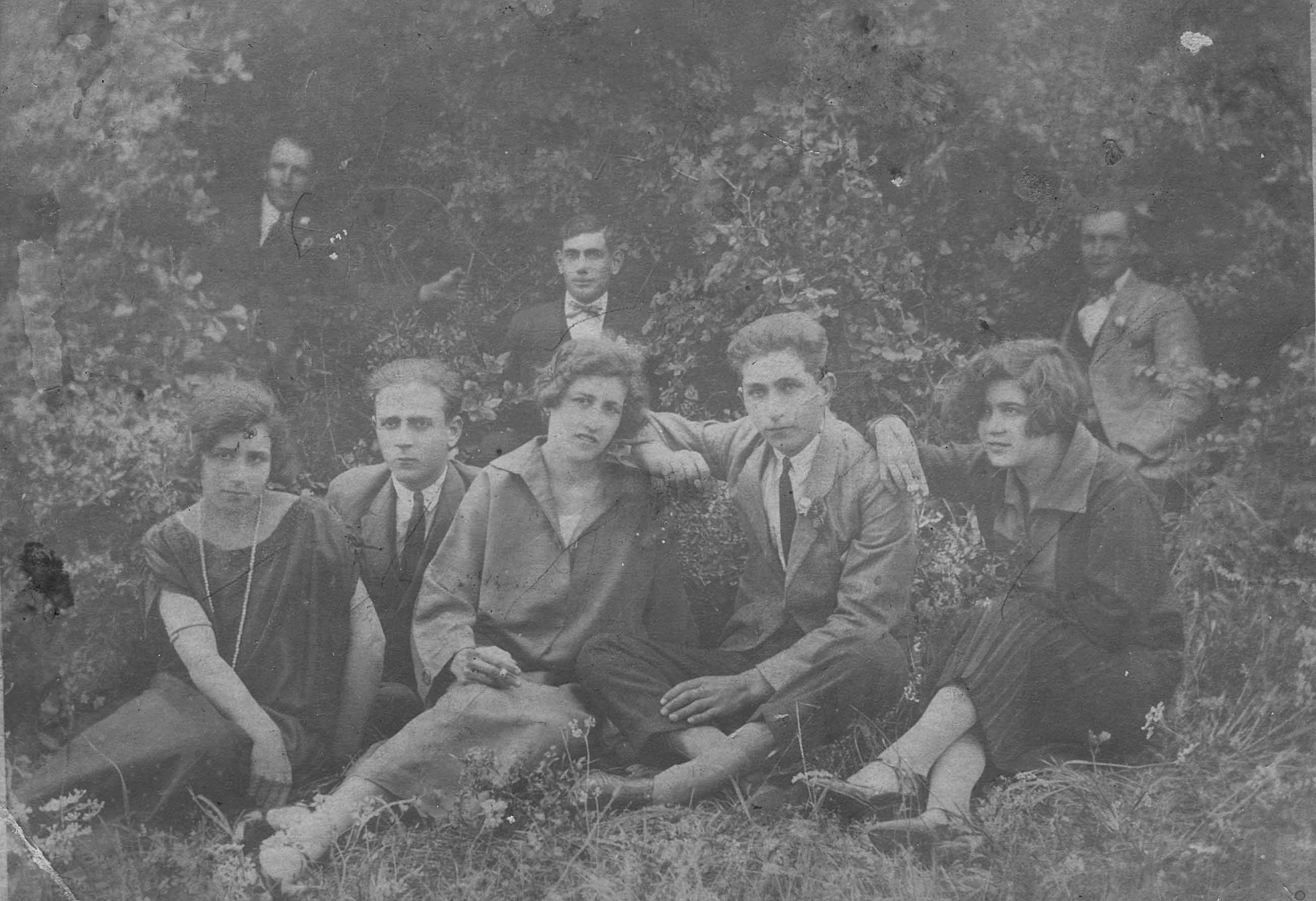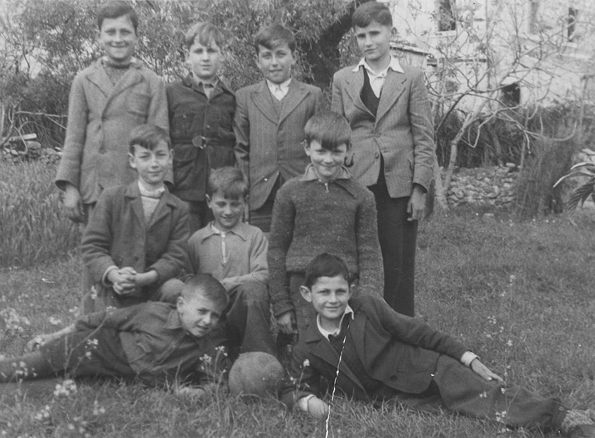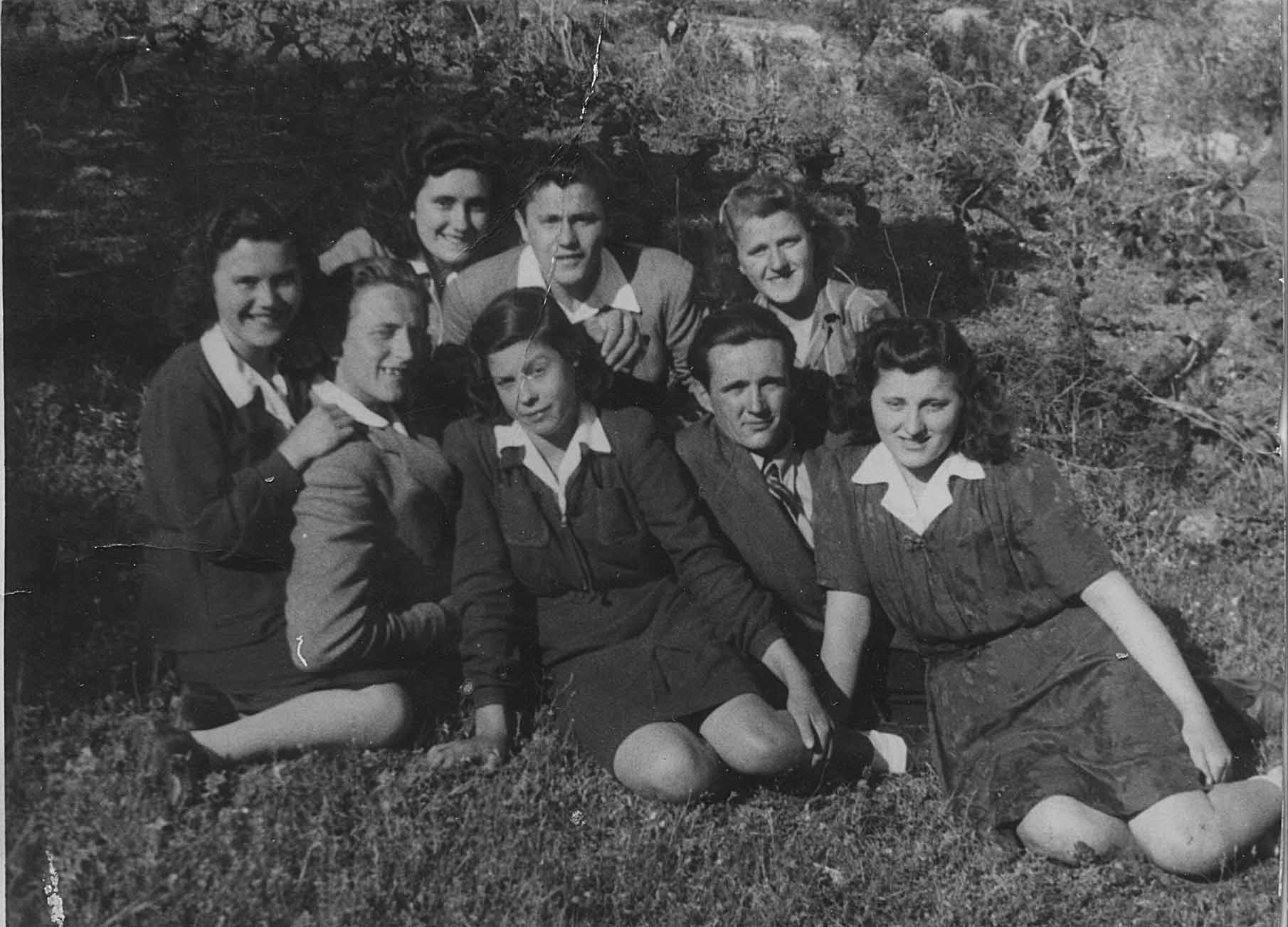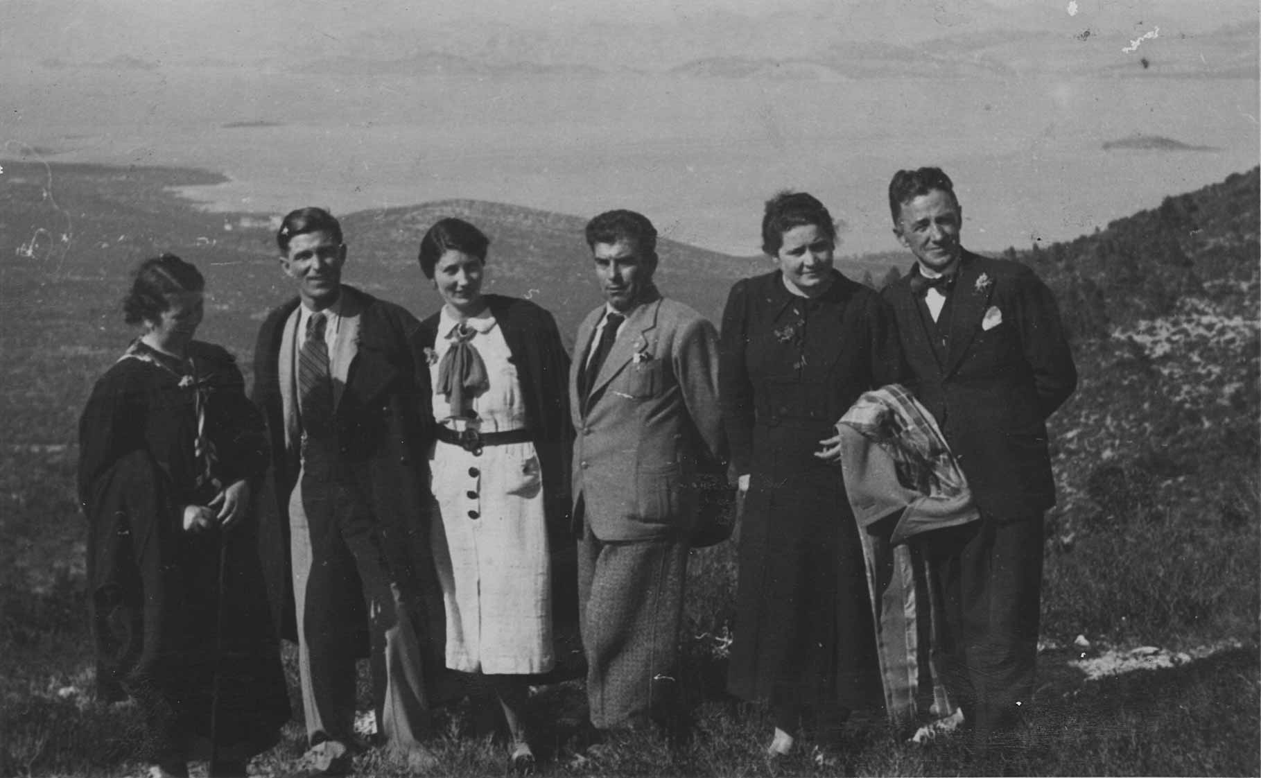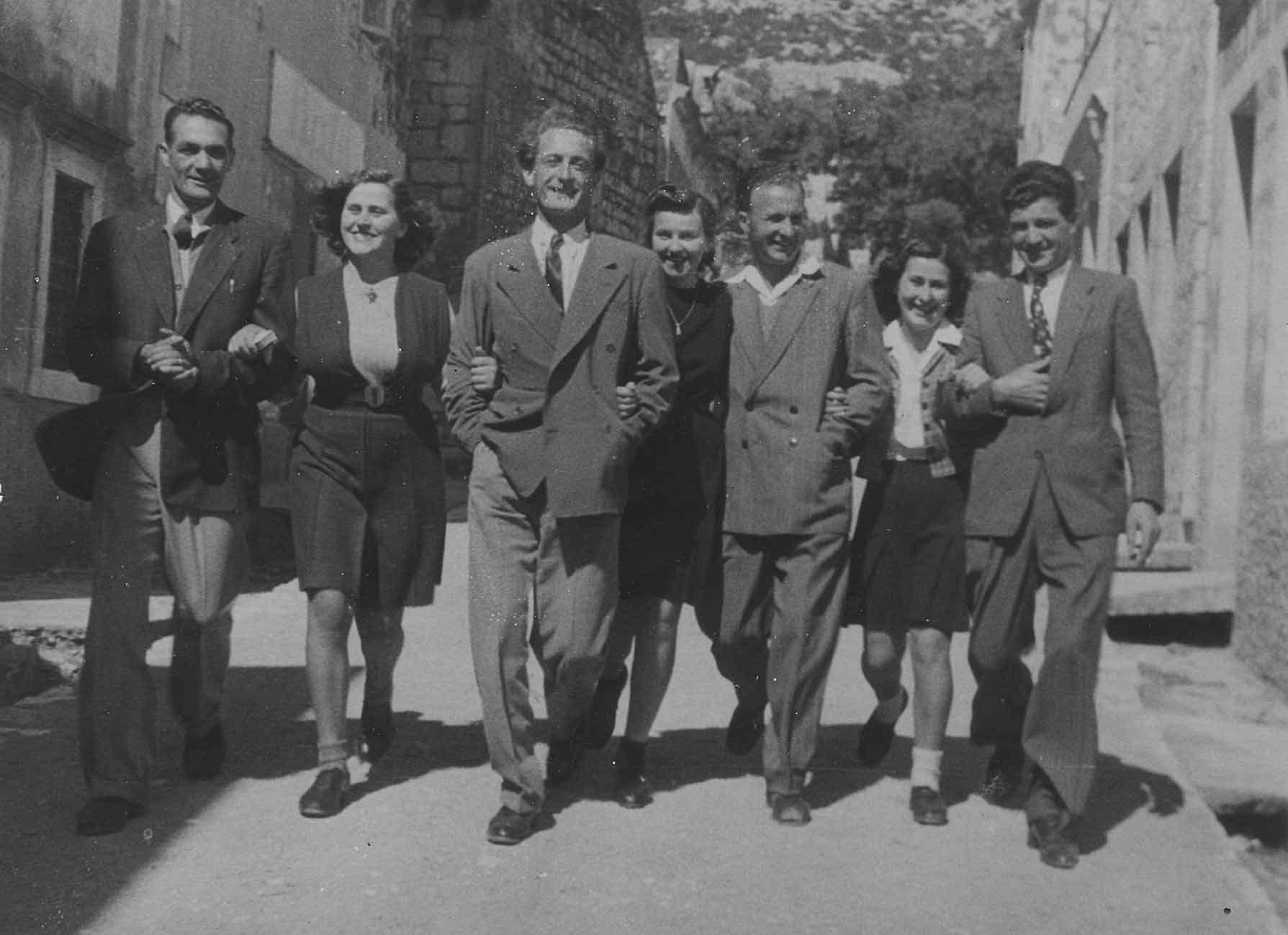 Prvi red (bliži): Zrinko Ivić?, Pera ili Toni Erzin, Slavija Buzolić, dr. N. Z. Bjelovučić Drugi red (iza): Ivoslav Bjelovučić, Marica Miletić, Rade Miletić, Anka Matijašica, ?, Jasna Miletić, Dinko Buzolić, Frano Glavović |