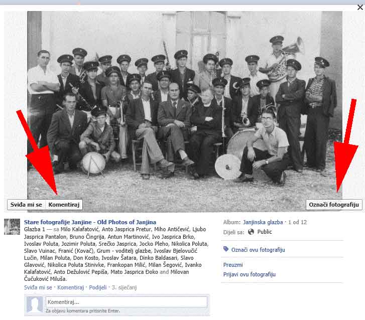 Nakon toga kada dođete na željenu fotografiju, pojavit će vam se "Komentiraj" i "Označi fotografiju" na toj fotografiji (pokazuju crvene strelice na slici dole), klikom na "Označi fotografiju" pojavit će Vam se križ kojim označite osobu (najbolje glavu!) koju poznajete i upišete ime pa "Enter" i kliknete na "Završeno označavanje". Za upisivanje komentara samo kliknite na "Komentiraj..."